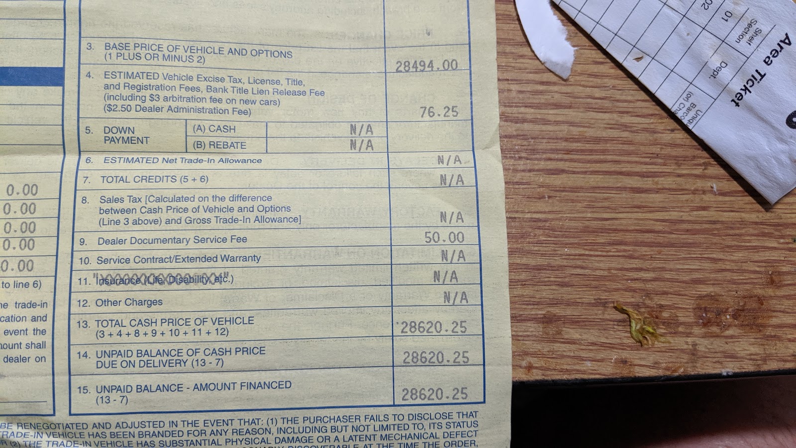 Finance $35,000 that is $656.33  a month.  But no sales tax credit means financing $37.500 or $703.21  a month or $46.88 more per month or just under 5 months to cover that $225 tab fee (234.40 saved)  $46.88 a month?? That is like...like...like paying for gas in a Prius! Caaaaraaazzzeee talk!